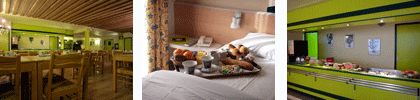 | Hotel *** bar-restaurant of 33 rooms with a seminar lounge:    10 Rooms « Confort » with twin bed for 1 or 2 persons ; 4 Rooms « Supérieures »  with twin bed or sofa for 1 to 4 persons (including 2 of them with facilities for disabled guests)